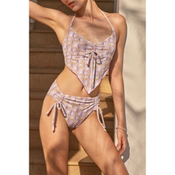 Bralette-style top with a triangle-shaped cut and ruched detailing , with adjustable straps that tie around the neck for a comfortable fit. Comes with bra pads and lining . the bottoms have a medium-cut with ruched detailing for a flattering look.