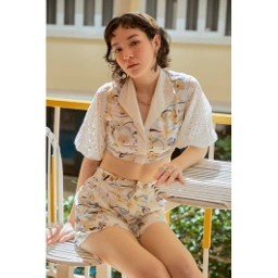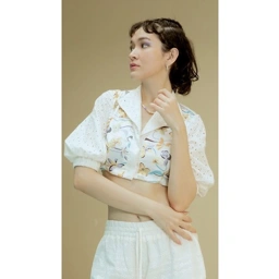 Susan crop top เสื้อคอปกพิมพ์ลายแขนลูกไม้ ดีเทลใคว้ผูกด้านหลัง
