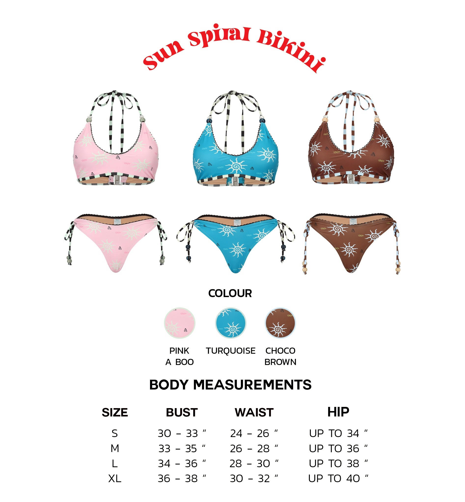Make a splash in our exclusive 'Free Spirit' Bikini, featuring a signature collection print and protective UV fabric. The halter-neck top is detailed with lace trim, striped beaded ties, removable padding, and a back clasp. It pairs with low-rise, medium-cut bottoms featuring matching lace trim and adjustable beaded side ties, both pieces fully lined for ultimate comfort and fit.