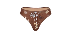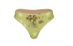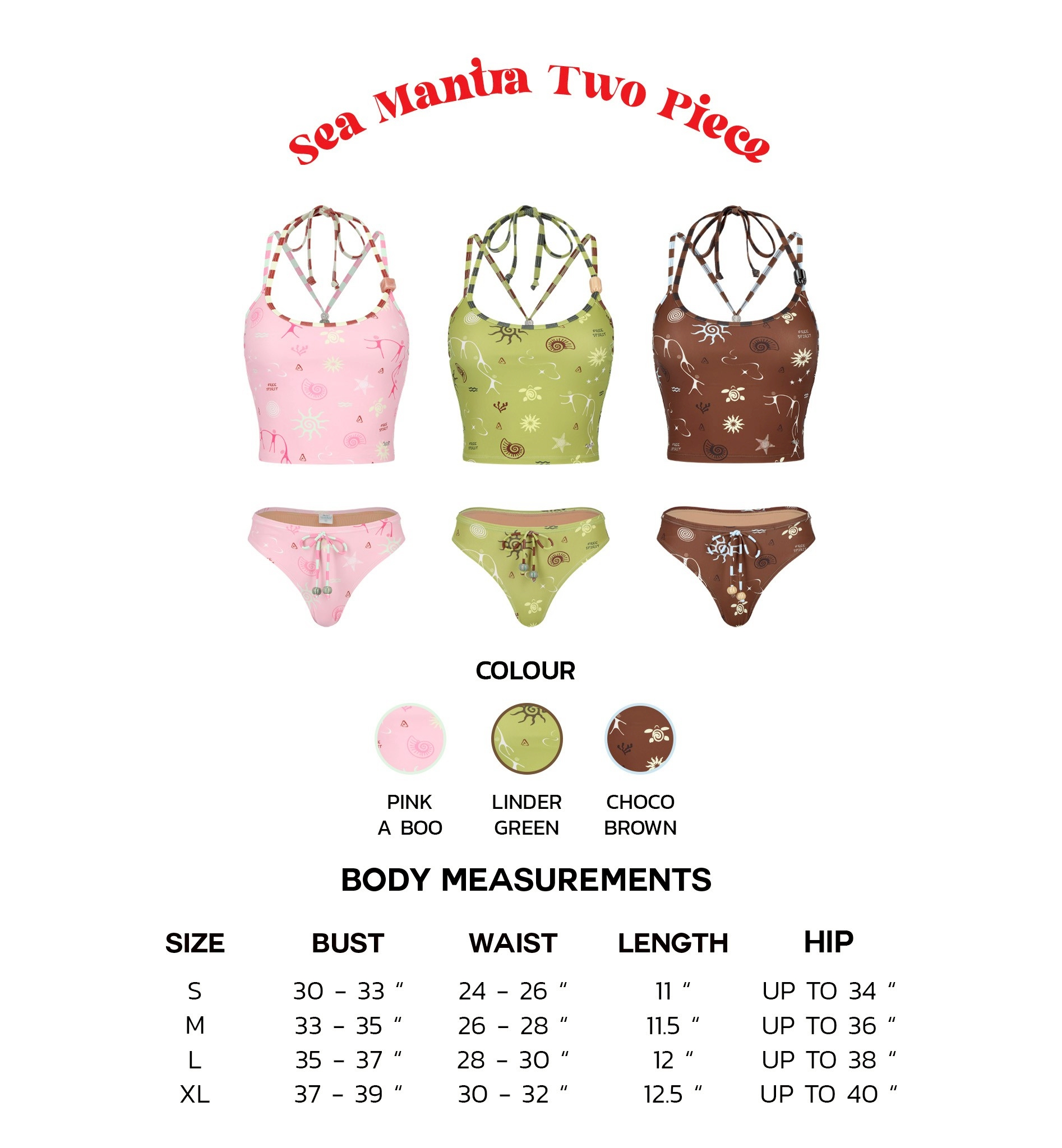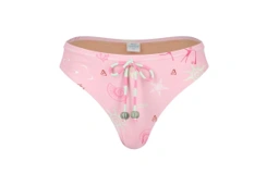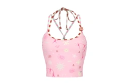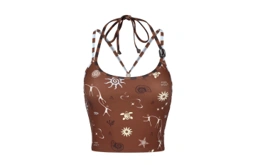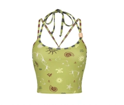 2 Piece swimwear Set, made from UV-protective fabric featuring the collection's signature print. The fitted crop top boasts spaghetti straps, a unique beaded halter neck tie that crosses at the back for a secure fit, and removable padding. The low-rise, medium-cut bottoms are styled with a functional front drawstring finished with beads. Both pieces are fully lined, making this set truly special and chic.