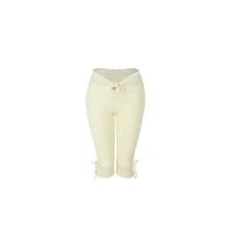 Our Capri pants offer a perfect blend of comfort and style. The slim-fit design naturally lengthens your silhouette, while the textured stretch fabric ensures mobility. Standout details include a cute front tie and subtle lace edging for added dimension. Coming with a full lining, this versatile piece is a summer must-have—easily styled with any top for a chic, clean-cut look every day."